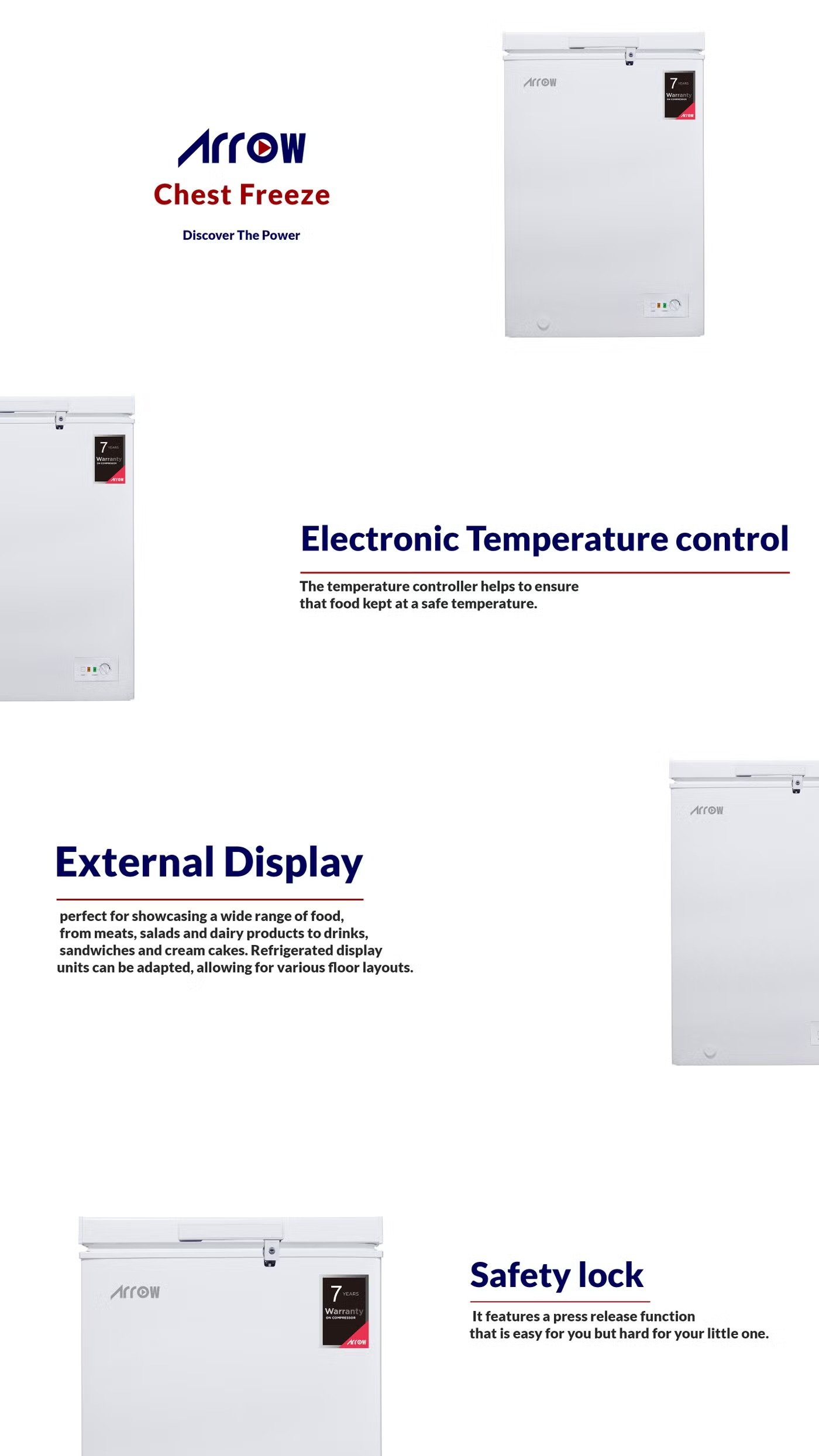 The Arrow 100L freezer provides reliable cooling with energy efficiency, ideal for keeping frozen foods fresh. Equipped with Multi Air Flow technology and a Super Freeze function, it ensures even cooling and rapid freezing. The No Frost system prevents ice buildup, making maintenance easy. With LED lighting for improved visibility and a durable compressor backed by a warranty, this freezer offers long-lasting performance and convenience.