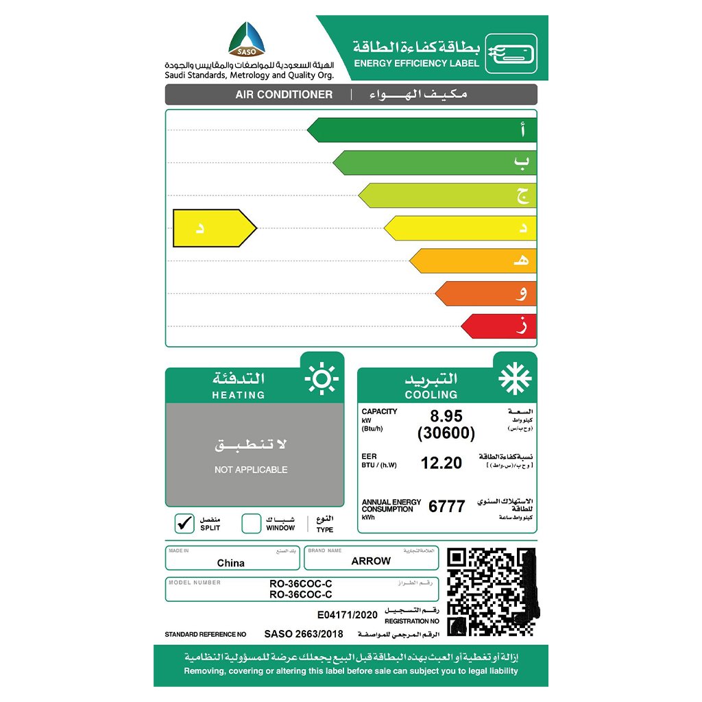مكيف ARROW سبليت موديل RO-36COC-C يعمل بنظام تبريد فقط بسعة قوية تبلغ 30600 وحدة حرارية بريطانية (8.95 كيلوواط)، مناسب للمساحات الكبيرة. يتميز بكفاءة طاقة EER 12.20 وتصنيف (د)، مع استهلاك سنوي للطاقة 6777 ك.و.س، ومصنّع في الصين وفق مواصفة SASO 2663/2018.
