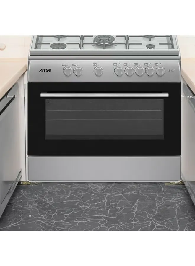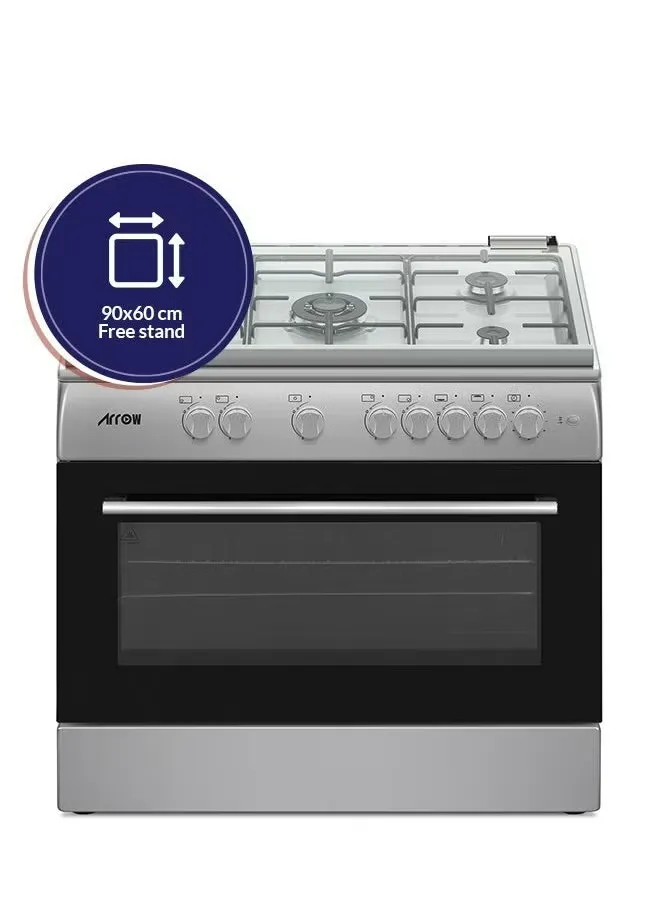 موقد غاز قائم بذاته بمقاس 90×60 سم مزود بـ5 شعلات غاز تشمل شعلة مركزية قوية لأداء احترافي داخل المطبخ المنزلي. يتميز بسطح طهي واسع يسمح باستخدام عدة أوانٍ في الوقت نفسه، وفرن كبير مع خاصية الشواء، وإشعال ذاتي، ونظام أمان كامل لمنع تسرب الغاز. تصميم عصري من الستانلس ستيل مع حوامل أواني متينة وغطاء زجاجي، ليجمع بين القوة، المتانة، والأناقة لطهي وجبات كبيرة بسهولة.